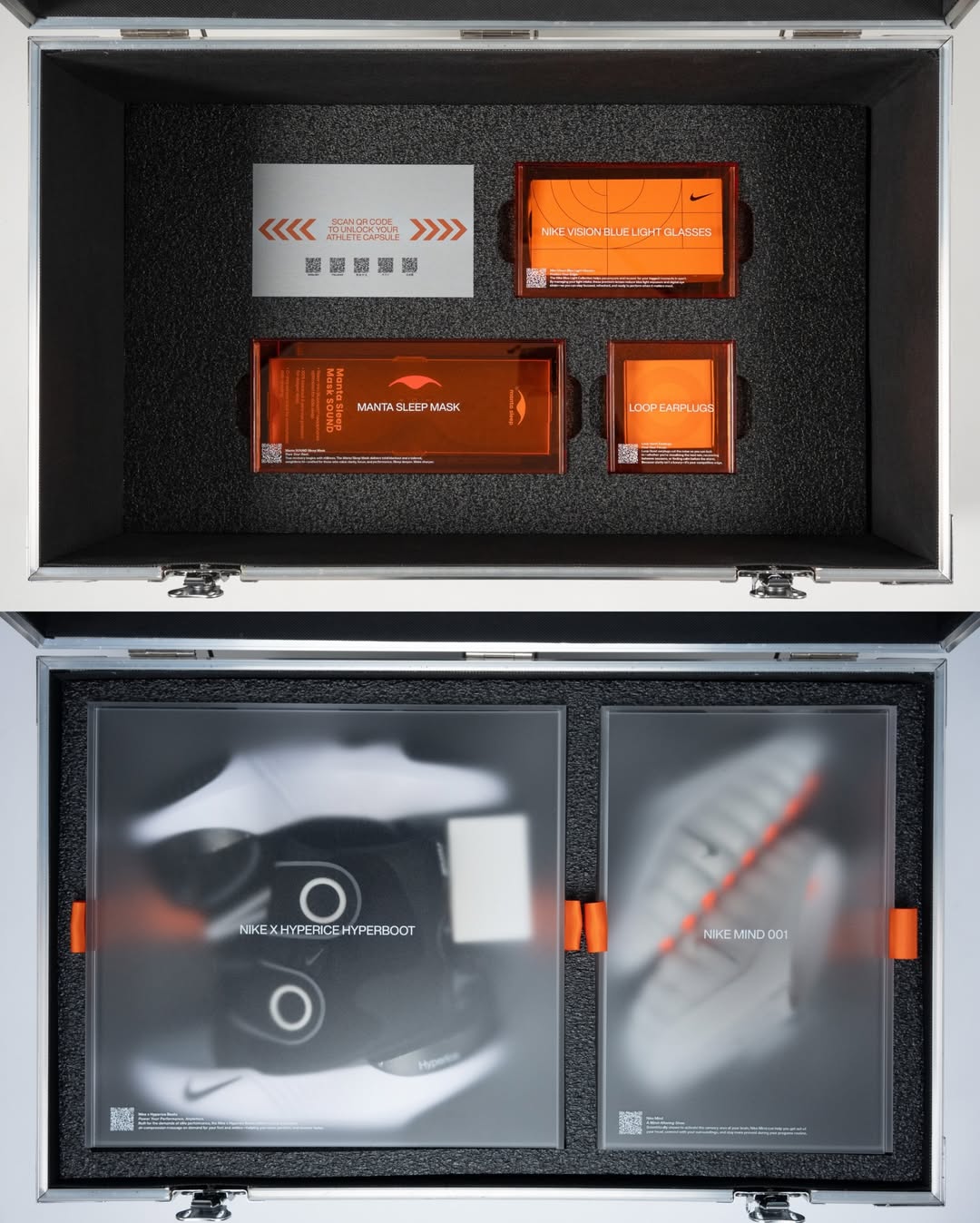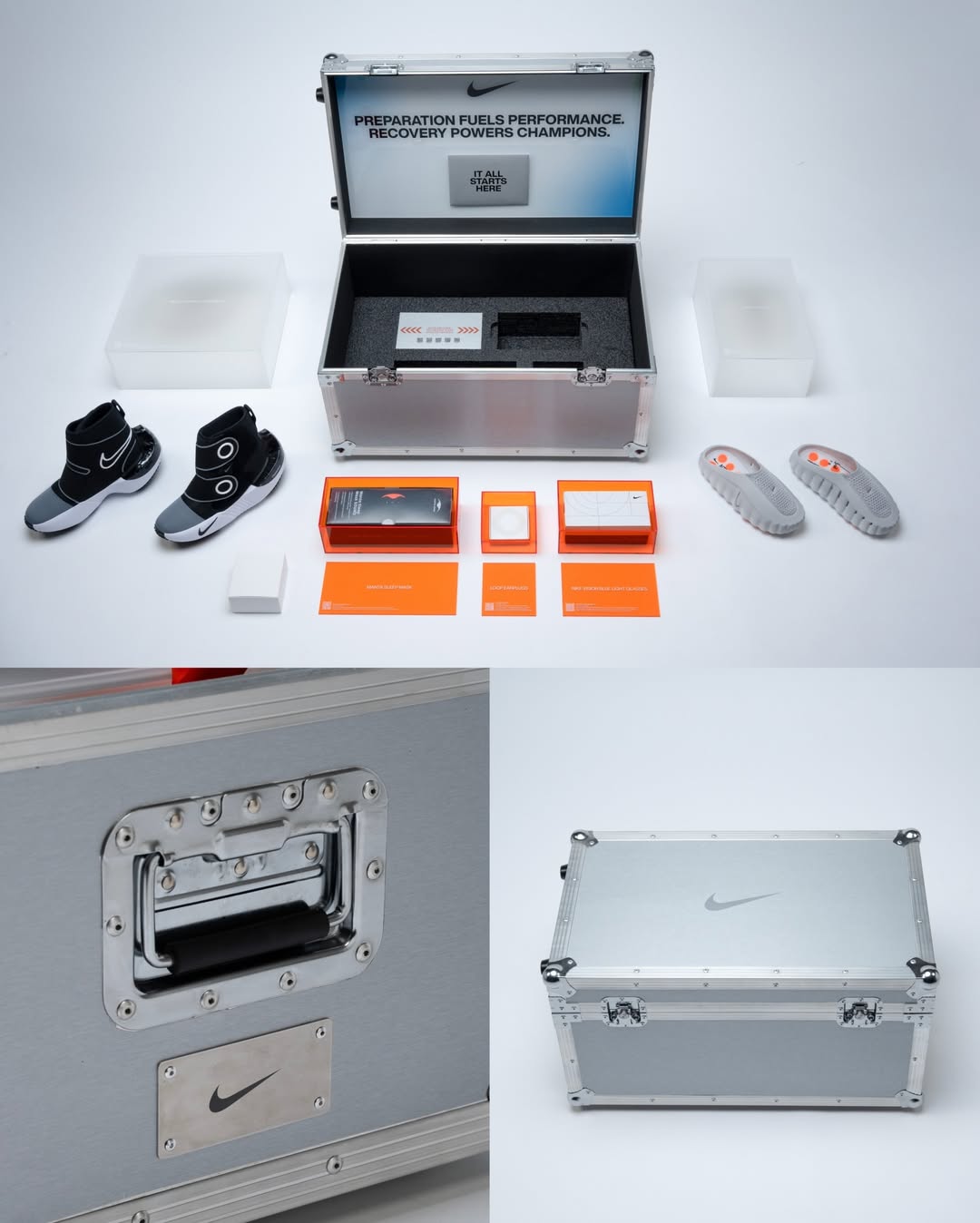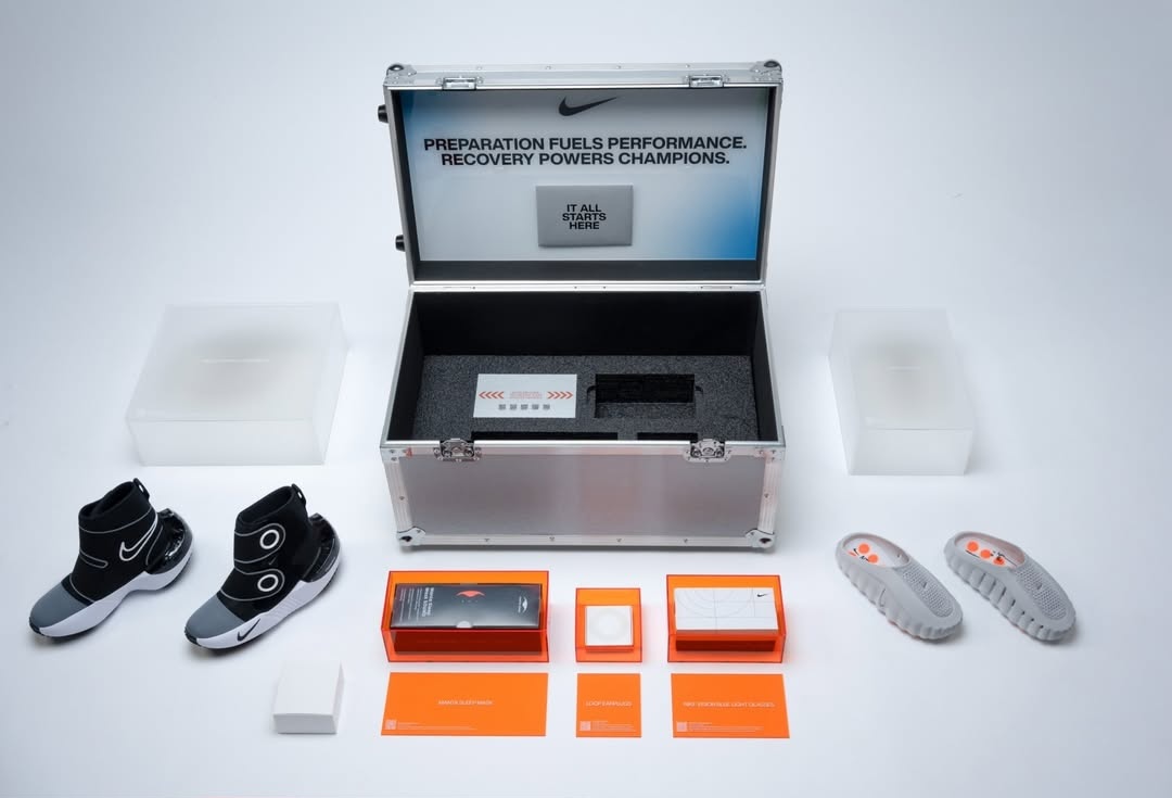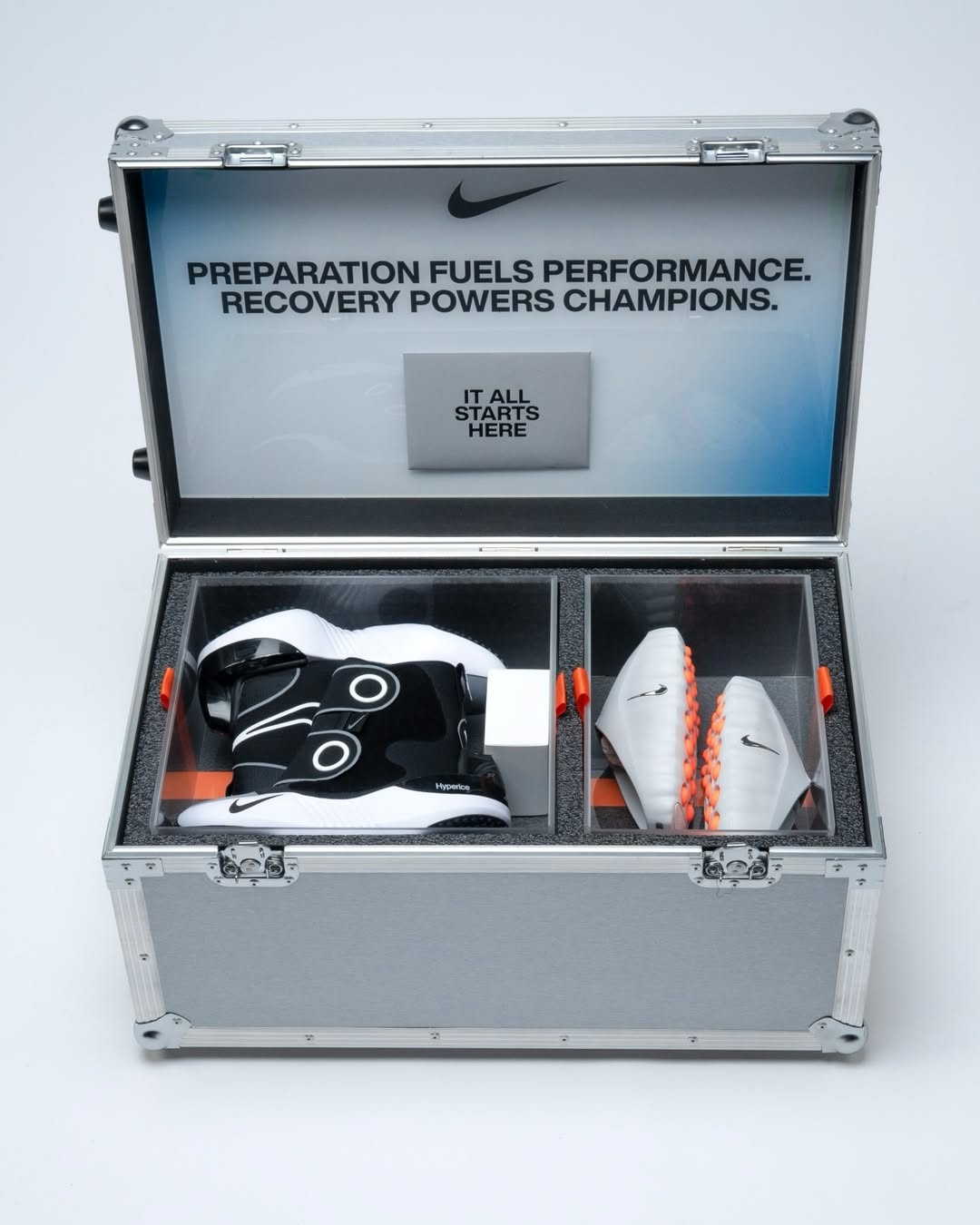 Dalším kouskem je bota, která vznikla ve spolupráci Nike s Hyperice — Nike × Hyperice Hyperboot. Nejde o obyčejné boty, ale o technologický „recovery boot“ kombinující dynamickou kompresi vzduchu a tepelnou terapii, která pomáhá zahřát nohy a kotníky rychleji před výkonem a urychlit regeneraci po něm. Technologie vychází z osvědčených systémů Normatec od Hyperice, ale převedená do nositelné high-top obuvi, kterou si sportovec obuje jako klasickou botu. Díky nastavitelným úrovním tlaku a tepla mohou atleti cílit na přesně ty partie, které během dne nejvíce zatěžují – což je při náročném olympijském programu obrovská výhoda. Kompresní vzduchové kanálky spolu s vyhřívanými prvky podporují lepší prokrvení, uvolnění svalů a zmírnění únavy, a to i během cestování nebo mezi jednotlivými závody. Jestliže jsou běžné kompresní rukávy či masážní přístroje pasivní, Nike × Hyperice Hyperboot přináší ten samý efekt v mobilní formě, kterou může sportovec používat i ve stoje nebo při chůzi.